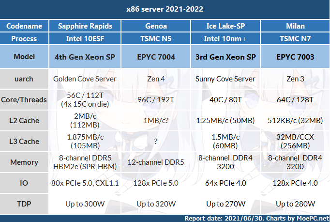 但是这一延期到2022Q2 会导致SPR的位置比较难堪。因为到2022年下半年AMD的EPYC 7004,代号Genoa就会发布。
