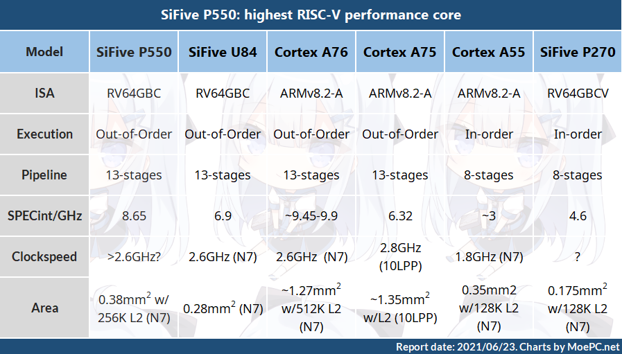 这次发布的P550支持RV64GBC(RV64IMAFDCB)指令集,13级 3-issue 流水线(和U84/A76/A75相同),乱序执行,32+32KB L1。在TSMC N7工艺下搭配256KB L2时的面积为0.38mm2。四核心丛集可搭配最高4MB L3。