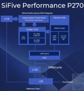 另一颗P270核心则更类似于Cortex-A55/A510。P270支持RV64GBCV(RV64IMAFDCBV)指令集,通过RV-V拓展支持256bit vector运算(VLEN = 256. DLEN = 128 (datapath width). ELEN = 64 (datatypes))。它只有8级 2-issue的流水(与A55相同),顺序执行,32+32KB L1。TSMC N7工艺下128KB L2配置面积为0.175mm2,是A55 0.35mm2的一半不到。