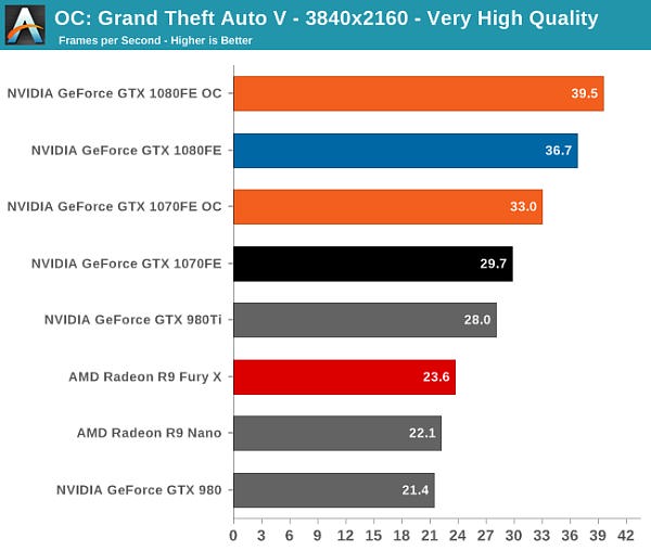 Overall we’re looking at an 8%-10% increase in performance from overclocking. It’s enough to further stretch the GTX 1080FE and GTX 1070FE’s leads, but it won’t radically alter performance.