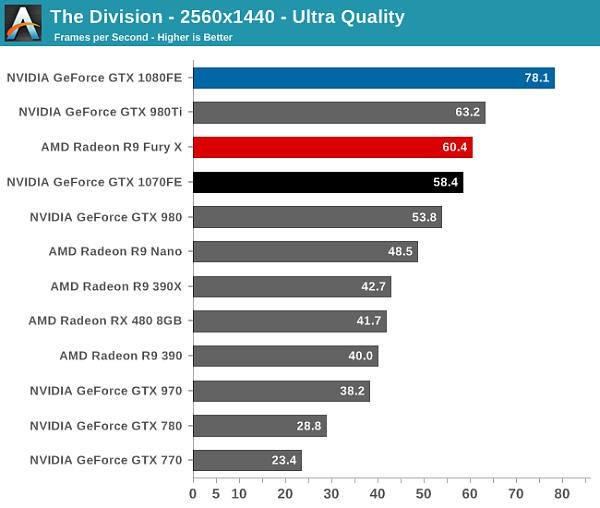 More than anything else, this game is unexpectedly sensitive to the differences between the GTX 1080 and GTX 1070. Normally the GTX 1080 would lead by 25% or so, but in The Division that’s a 33% to 40% lead. It’s more than you’d expect given the differences between the two cards’ configurations, and while I suspect it’s a combination of memory bandwidth differences and ALU throughput differences, I’m also not 100% convinced it’s not a bug of some kind. So we’ll have to see if this changes at all.