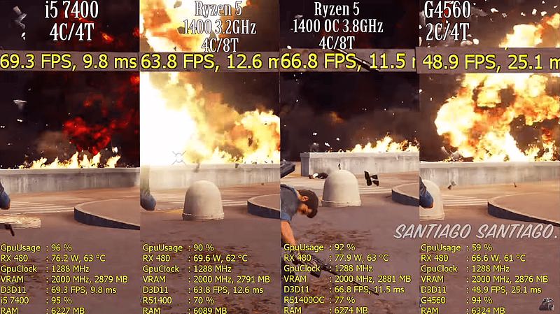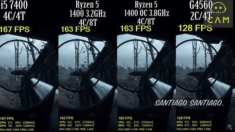 AMD Ryzen 5 1400 OC vs Intel i5 7400 vs Pentium G4560游戏测试