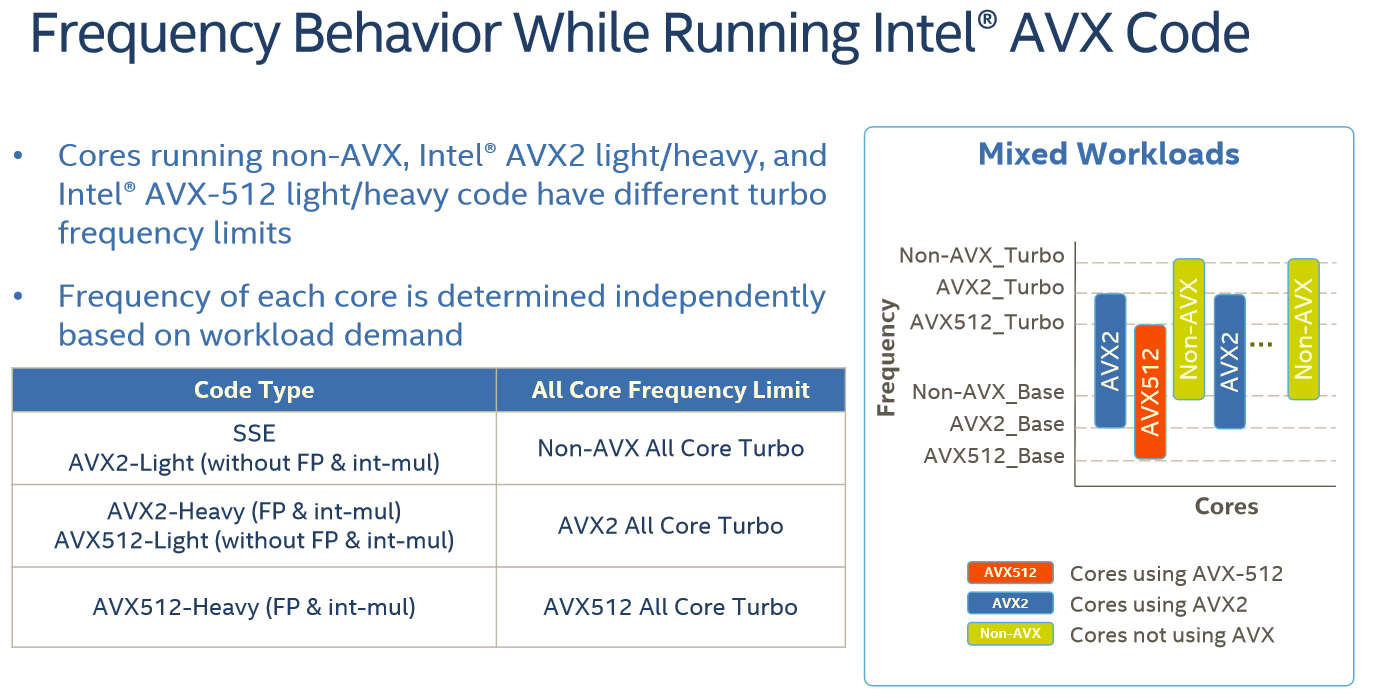 非AVX/AVX2.0/AVX-512加速模式频率对比